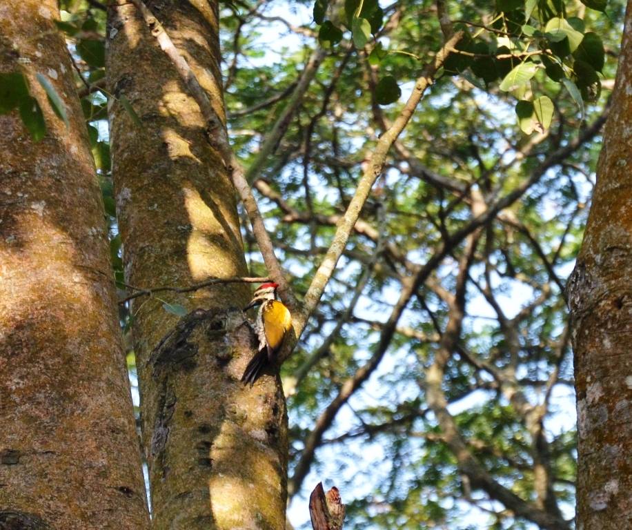 A woodpecker is sitting on a tree
